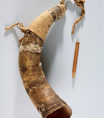 O objeto consiste em 17 penas longas de cauda de pássaro, com o lado de fora azul escuro, azul claro e vermelho e o lado de dentro vermelho e marrom, terminadas com penas menores, bege e marrom listradas. As hastes das penas longas foram enroladas, passadas sobre um fio grosso de algodão e amarradas junto …