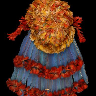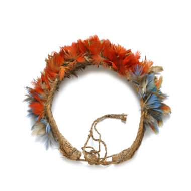 Coifa composto por uma touca e um cobre nuca. A touca consiste em um capacete redondo de tecido grosso e amarelado, que parece ter sido de crochê. A superfície externa da tampa é coberta com tufos de pequenas penas montadas em conjuntos de duas, presas a ambas as extremidades de um cordel costurado ao tecido. …