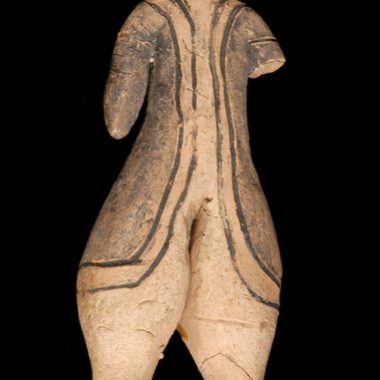Em argila crua “irisada”, representando um homem. A cabeça foi quebrada no pescoço. Os braços são representados por bolas de argila paralelas ao corpo. Ambos foram quebrados no ponto em que se destacam do corpo; o direito foi colado de volta, o esquerdo perdeu. O corpo flama e se separa em dois cilindros que representam …