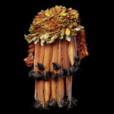A touca é composta de uma tampa redonda de tecido de algodão muito grosso e amarelado, que parece ter sido de crochê. A parte externa da tampa é coberta com pequenos tufos de penas amarelas, vermelhas e azuis montadas em pares, presos em ambas as extremidades de um cordão costurado no tecido. Um fio pende …