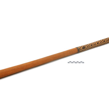 Haste de junco “Taquara”. Ponta de madeira terminada com uma ponta de espinha de peixe com farpas finas, fixadas com um fio de algodão. Ligadura entre a madeira e a palheta, feita de casca de árvore. Na outra ponta: um ornamento composto por duas grandes plumas multicoloridas e várias pequenas plumas amarelas. Os tubos são …