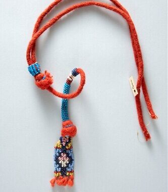 Adorno de penas de papagaio verde-laranja-azul às quais são adicionadas penas amarelas de japim mais 2 penas de arara vermelha (no centro) montadas em uma fieira sobre um suporte de fio de algodão. Adorno confeccionado e usado pelos homens (que têm o privilégio desta pena) por ocasião de quase todas as festas, mais particularmente durante …