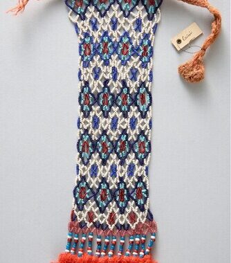 Espécie de bolsa em fibras de palmeira de Buriti trançada representando a cabeça (olhos vazados e pinturas amarelas, brancas e pretas para os encaixes) provida de uma saia longa “de folhas de palmeira. Peça feita por homens e usada por todos os homens exceto os que usam outra máscara durante a festa do “kôkô”., esta …