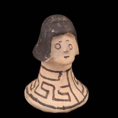 neca de cerâmica. Ela representa um homem mascarado. A máscara cobre inteiramente a cabeça e o corpo, apenas os membros inferiores são visíveis. Argila cinzenta pintada de preto. A parte superior da máscara tem vários buracos. Altura máxima 13 cm; largura 5,5 cm