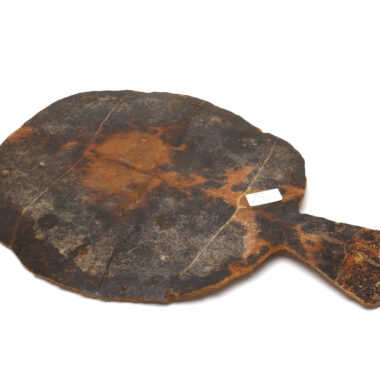 Chocalho composto por uma cabaça esférica contendo pequenas sementes chocalhadas e cruzada em seus mastros por um cabo de madeira cilíndrico e transfixante. A extremidade mais curta do cabo termina com um monte de penas presas por uma emenda de cordas. A cabaça é decorada com uma decoração linear pirografada e perfurada com quatro grupos …