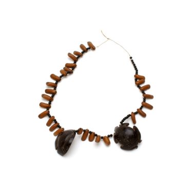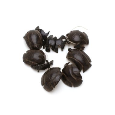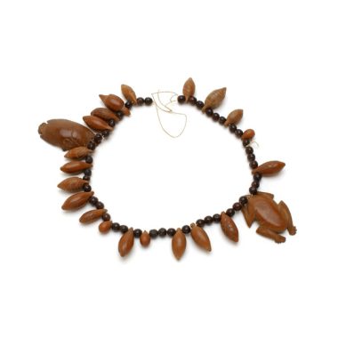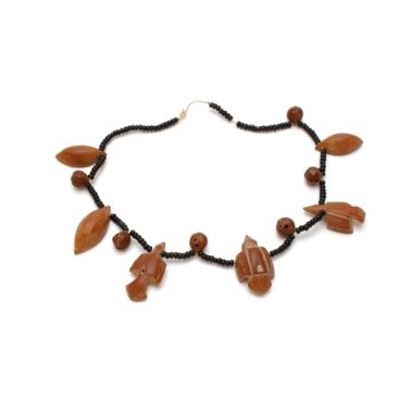 Cascas de frutos marrom-escuras esculpidas em forma de animais (pássaros , peixes , tartarugas etc). Usado para fazer colares. Conjunto composto por dez peças ligadas por um fio.