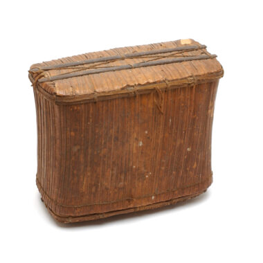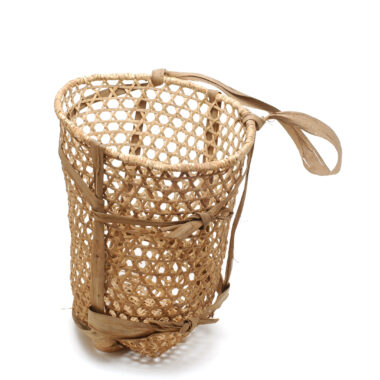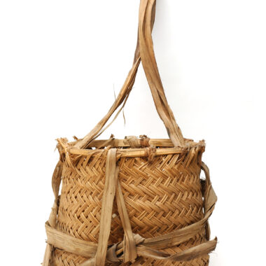 Capuz: cesto munido de uma alça ou faixa de transporte em fibra de casca de árvore de aprox., E trançado em fibras de cipó liana. Trançado a céu aberto e fornecido com uma alça ou faixa de transporte em fibra de casca de árvore de aprox. Utensílio feito por homens e utilizado por ambos os …