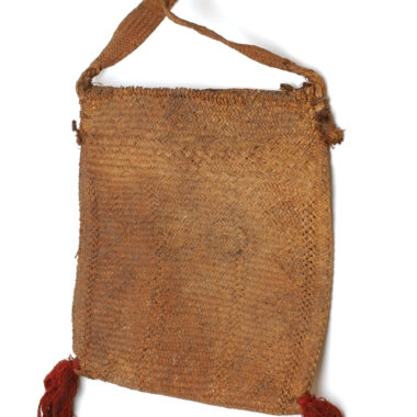 Objeto tecido com fibras de palmeira de Buriti (ngrwa’ô “) e munido de uma tira suspensa do mesmo material. Peça feita por mulheres e utilizada quase que exclusivamente por mulheres como recipiente para sementes secas de urucum ou babaçu O objeto está suspenso da moldura da casa “2 pingentes de linha vermelha importada.