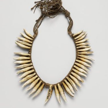 Colar feito de vários cordões de algodão muito sujo, no qual são montados 38 dentes de onça-pintada, de altura variável. Os mais altos são montados na parte do meio e os menores nas extremidades. Originalmente, havia 40 dentes, mas faltam dois dentes. A base dos dentes tem um buraco e uma das cordas foi passada …