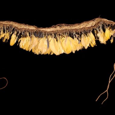 A touca é composta de uma tampa redonda de tecido de algodão muito grosso e amarelado, que parece ter sido de crochê. A parte externa da tampa é coberta com pequenos tufos de penas amarelas, vermelhas e azuis montadas em pares, presos em ambas as extremidades de um cordão costurado no tecido. Um fio pende …