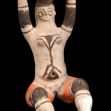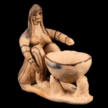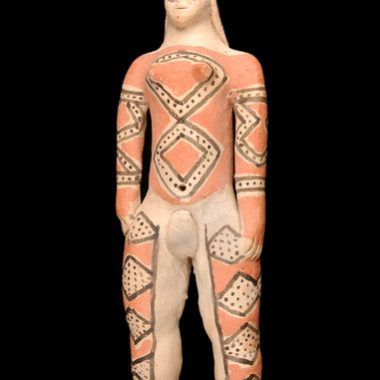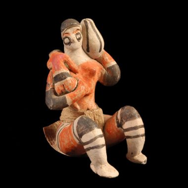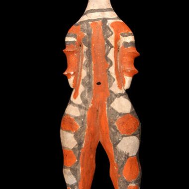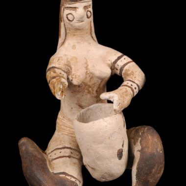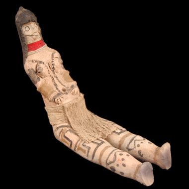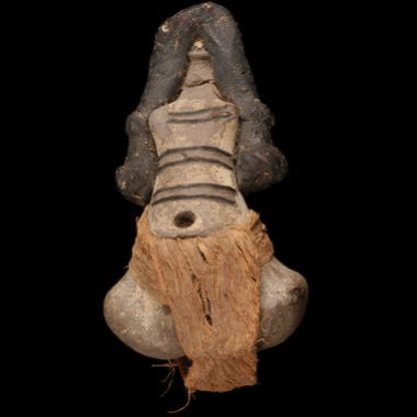 Boneca de cerâmica representando uma mulher grávida, sentada, com os braços descansando sobre o estômago. Ela usa um colar feito de fio de algodão branco e vermelho, uma tanga feita de casca de árvore batida, e pulseiras grandes, pintadas de bege. Os dois pequenos círculos nas bochechas são marcas tribais. A tinta preta e bege …