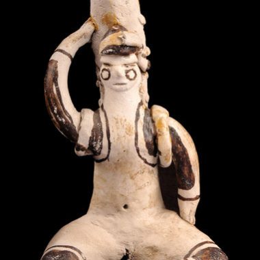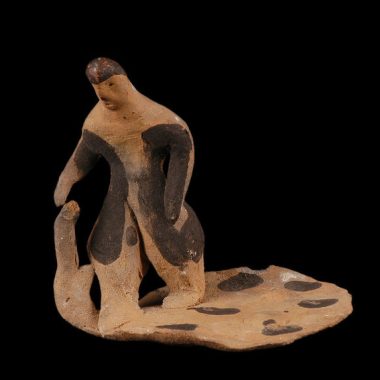 Figurino cerâmico pintado de preto. Ela representa uma figura de pé, apoiada em um suporte impreciso. A cena repousa sobre uma placa fina e circular. Altura máxima 6,5 cm, largura máxima 7 cm. Esta peça é de uma obra grosseira e mais moderna. Foi coletado em 1951.