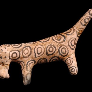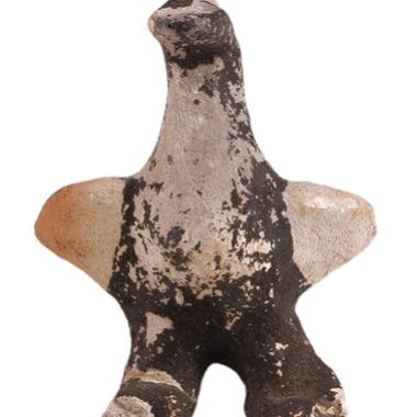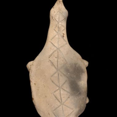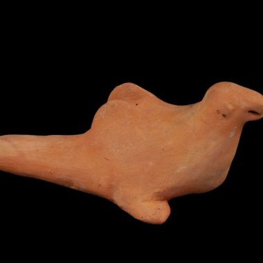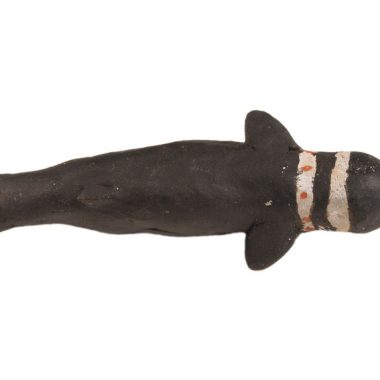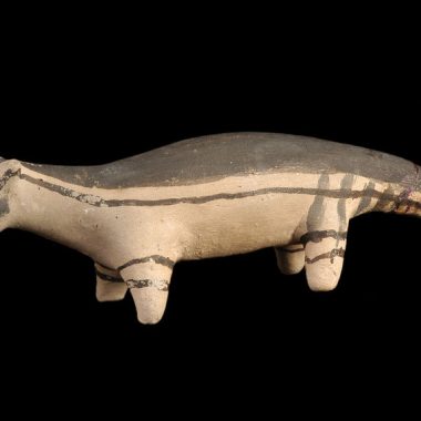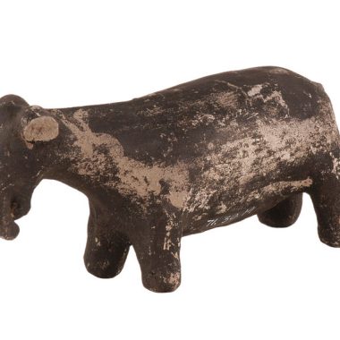 Figura de cerâmica pintada de preto. Ela representa uma anta (uma orelha está quebrada). Altura máxima 6 cm, comprimento 13 cm, espessura 4 cm
