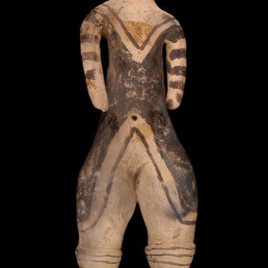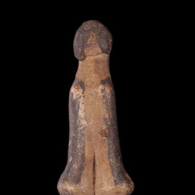Figurino cerâmico pintado de preto. Ela representa uma figura de pé, apoiada em um suporte impreciso. A cena repousa sobre uma placa fina e circular. Altura máxima 6,5 cm, largura máxima 7 cm. Esta peça é de uma obra grosseira e mais moderna. Foi coletado em 1951.