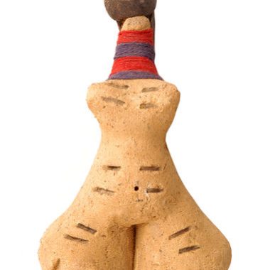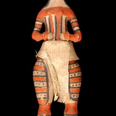 Boneca de cerâmica cinza – Representa um homem (?) sentado de pernas cruzadas, carregando um capuz nas costas e segurando-o com uma mão. O capuz é preso aos ombros por duas amarras e é preenchido com frutas ou legumes (bananas ou magnoc?). A tinta preta da carroceria é distribuída simetricamente. Marcas tribais nas bochechas; H. …