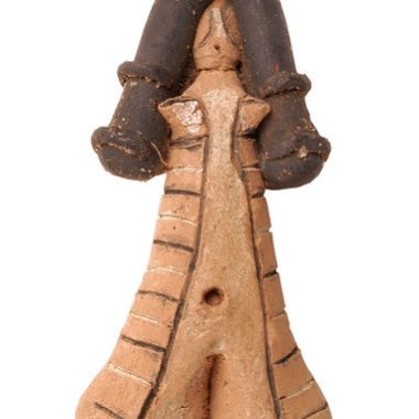 Boneca de cerâmica representando uma mulher grávida, sentada, com os braços descansando sobre o estômago. Ela usa um colar feito de fio de algodão branco e vermelho, uma tanga feita de casca de árvore batida, e pulseiras grandes, pintadas de bege. Os dois pequenos círculos nas bochechas são marcas tribais. A tinta preta e bege …