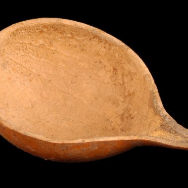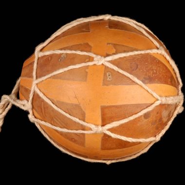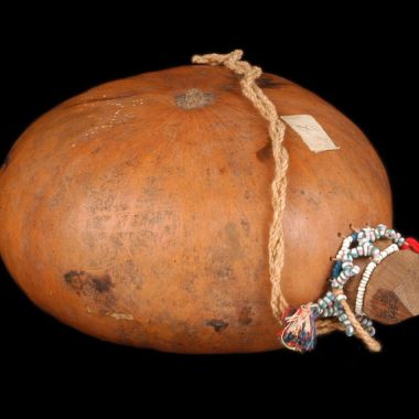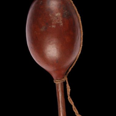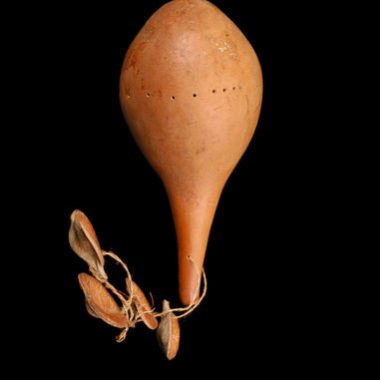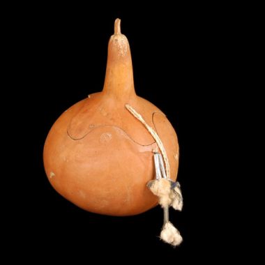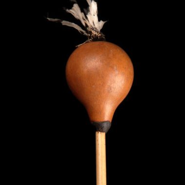 Chocalho feito de uma cabaça em forma de ovo com tinta preta (anéis). Um bastão é passado pelo corpo da cabaça, escalfado em ambos os buracos. O cabo é coberto com uma trança de palha bege e marrom formando uma decoração, uma ligadura de casca de árvore. Do alto da cabaça penduram várias plumas multicoloridas.