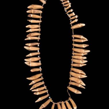 Colar feito de vários cordões de algodão muito sujo, no qual são montados 38 dentes de onça-pintada, de altura variável. Os mais altos são montados na parte do meio e os menores nas extremidades. Originalmente, havia 40 dentes, mas faltam dois dentes. A base dos dentes tem um buraco e uma das cordas foi passada …