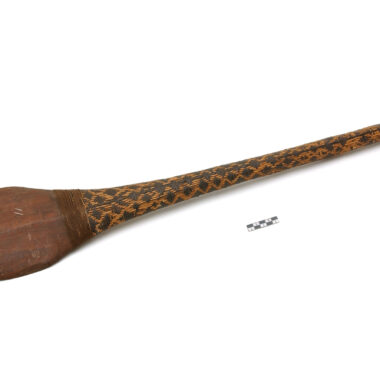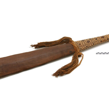 O cabo (metade inferior da peça) é revestido com um entrançado de fibras de palmeira (claras) e fibras de ambé (escuras) e termina lateralmente com 2 pendentes em franja. Ver arquivo 40785 (Informações sobre o acervo). Caça, guerra e dança. Objeto feito pelos homens (cada homem tem sua própria tecelagem) e usado por eles para …