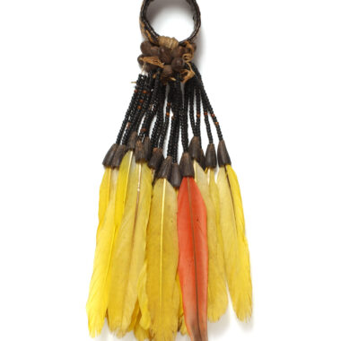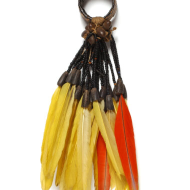Pulseira em fibras trançadas de ambé e fibras de palmeira (bege), recebendo pendurado 4 grandes penas de arara vermelha mais um cacho de nozes “mais nozes de tucum e também pequenas contas azuis. Esta peça é feita pelos homens (as mulheres trabalham as nozes) e usado por crianças de ambos os sexos durante a fase …