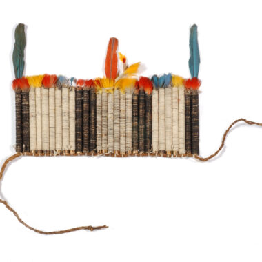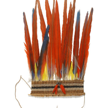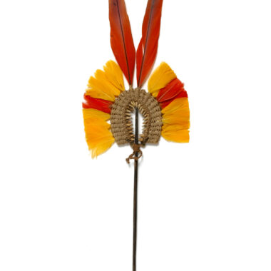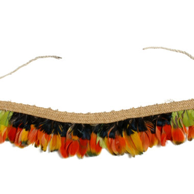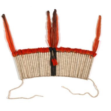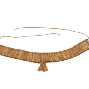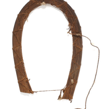 Objeto em fibras de palma coladas umas às outras e dispostas em forma de ferradura. Ligadura com fio de algodão. Peça confeccionada por homens e usada por ambos os sexos como suporte de todas as tiaras do gênero àkyara. “Objeto de acompanhamento n ° 040852. A peça é aplicada na nuca do usuário por meio …