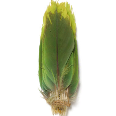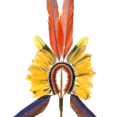 Losango de fio de algodão preto, marrom e bege montado em um poste de madeira; cada extremidade do losango recebe uma pena de arara vermelha e uma pequena pena amarela. cf. 40879., Este brasão é usado com a haste cravada no Cocar de cera (cf. 40877-79). Nota A.Vuille 21.06.2016: informação retirada do campo termo vernáculo: …