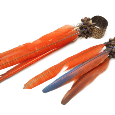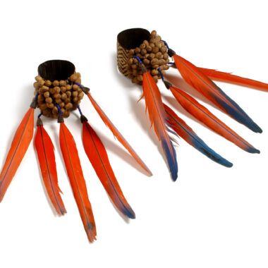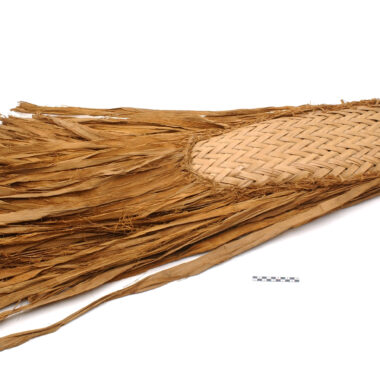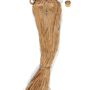 Objeto provido de um cordão de fio de algodão e composto por costelas de palmeira unidas entre si por meio de uma trança de fio de algodão e pequenas varetas de madeira. Peça confeccionada por homens e utilizada por ambos os sexos: 1) como pente; 2) mais raramente como um adorno pendurado dorsalmente no colar …