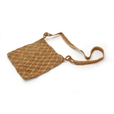 Bolsa pequena em fibras vegetais com nós e parcialmente tingidas