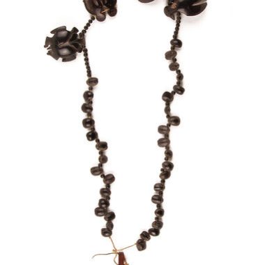 Faixa longa de cestaria. A faixa é tecida com fibra de planta preta para criar um padrão de diamante. As extremidades são pressas com algodão torcido.