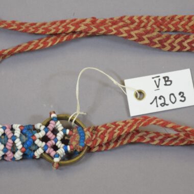 Máscara de tapa marrom. Rosto enegrecido de alcatrão, olhos formados por pequenos retângulos de metal branco. 2 orelhas pontudas, nariz protuberante feito de uma tira fina de madeira enegrecida; boca de madeira proeminente, com dentes salientes. Foi relatado pelo Sr. Palacio Garcia e entregue ao Sr. Deutschmann.