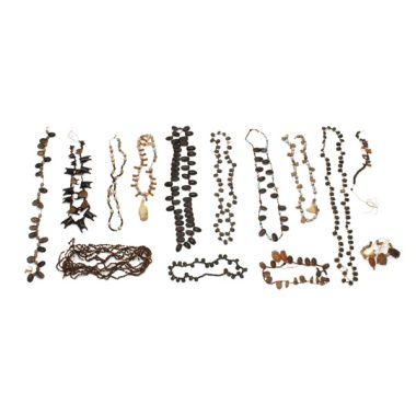 Conjunto de vários colares de sementes, frutos e dentes
