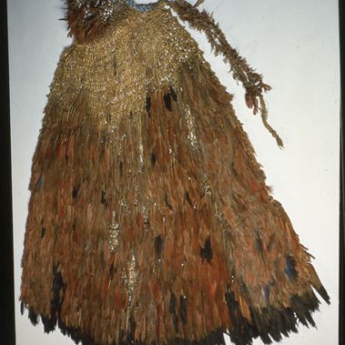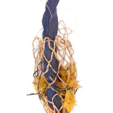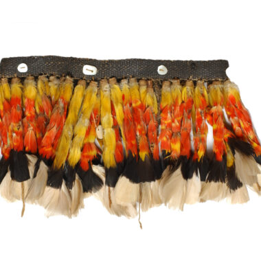 Adorno de cintura do tipo cinta, composto por uma trança de algodão tecido e coberto com resina preta de cada lado , dos quais estão suspensos trinta e sete pingentes de penas , formando uma franja colorida de 165 mm (vermelho , amarelo , preto , branco). A trança é ainda adornada com seis pequenas …