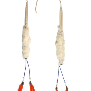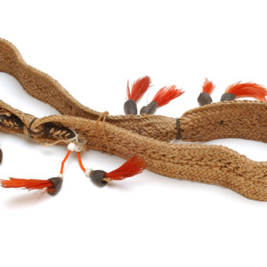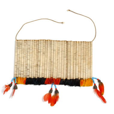 Peça idêntica a 40940 mas com 5 pendentes (pinna grande de arara vermelha mais noz de tucum). Esta peça é feita por mulheres e usada por meninos e meninas na fase final de imposição do nome. Esta peça é normalmente usada como um par de suéter cruzado. A técnica de lockpicking teria sido emprestada dos …