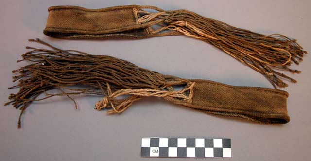 Adorno Faixas usadas abaixo do joelho Acessar item no Acervo do museu de origemDocumentação Em “Termos de Uso”, disponíveis em (https://www.peabody.harvard.edu/node/778) explicita-se que o website é mantido pelo Peabody Museum of Archaeology and Ethnology, da Universidade de Harvard, que pode alterá-los a qualquer momento sem aviso prévio. O uso do website deve estar em concordância com: 1. O Site e grande parte do texto, imagens, gráficos, clipes de áudio e vídeo, informações e outros conteúdos do Site (coletivamente, o “Conteúdo”) são protegidos por direitos autorais, marcas registradas e outras leis. 2. O Conteúdo é disponibilizado somente para seu uso pessoal limitado, não comercial para fins educacionais ou acadêmicos, ou para outro uso justo na extensão permitida pela lei de direitos autorais dos Estados Unidos. A menos que especificado de outra forma no Site, você pode empregar as funções normais de seu navegador para baixar e imprimir uma única cópia de arquivos de Conteúdo individuais para tal uso, desde que você mantenha todos os direitos autorais e outros avisos de propriedade associados ao Conteúdo. Você deve citar o autor/artista e a fonte do Conteúdo como se fosse conteúdo de qualquer trabalho impresso, e a citação deve incluir a URL www.peabody.harvard.edu; 3. Concedem a permissão limitada acima sob os direitos autorais que possuem. Os direitos autorais e outros direitos sobre o Conteúdo também podem ser detidos por outros indivíduos ou entidades, incluindo artistas e outros detentores de direitos sobre as coleções do Museu Peabody reproduzidas no Site; 4. Usos Proibidos. É proibido copiar, exibir, publicar, distribuir, transmitir, modificar, executar ou utilizar ou explorar qualquer Conteúdo protegido no Site para qualquer propósito comercial ou com o propósito de torná-lo publicamente disponível. É proibido incluir qualquer Conteúdo protegido em um banco de dados, website ou recurso eletrônico, e de fazer qualquer outro uso do Conteúdo protegido que não seja expressamente permitido pela Seção 2; 5. Para solicitar permissão, sob direitos controlados por nós, para qualquer uso de outra forma proibido, favor entrar em contato com o Peabody Museum of Archaeology and Ethnology’s Office of Rights and ReproductionsPovo Indígena Karajá Autodenominação: Iny Iny Karaja Outros nomes para o povo: Carajás Localização: America do SulBrasilGoiás (GO)Mato Grosso (MT)Pará (PA)Tocantins (TO)Museu Peabody Museum (Cambridge, EUA) Localização: América do NorteCambridgeEstados Unidos Número de tombo: 18-12-30/F166 Número anterior: 18-12-30/F166Tipo de Acervo: EtnológicoCaracterísticas Dimensões: 32,5 x 3,2 x 2,3 cm 12 13,16 x 1 1,4 x 7,8 cm Quantidade de componentes: 2 Material/Suporte: AlgodãoTesauro (FUNAI) Artefatos: Adorno corporalAdorno para MembrosJarreteira Matérias Primas: Produto de origem VegetalProveniência Coleta: América do Sul, BrasilHistórico Cedente: Anonymous Coletor:Anônimo Forma de Aquisição: : Selecione Exportar ObraFaixas usadas abaixo do joelho