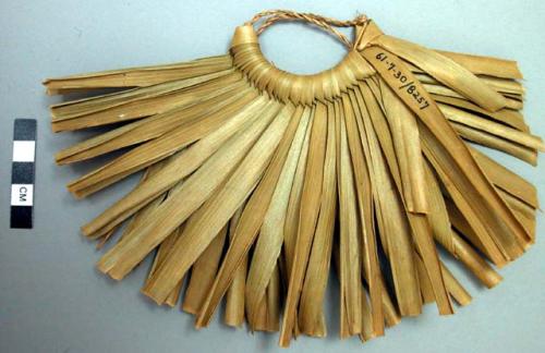 Adorno Adorno de cabelo feito de palmeira de catolé Acessar item no Acervo do museu de origemDocumentação Em “Termos de Uso”, disponíveis em (https://www.peabody.harvard.edu/node/778) explicita-se que o website é mantido pelo Peabody Museum of Archaeology and Ethnology, da Universidade de Harvard, que pode alterá-los a qualquer momento sem aviso prévio. O uso do website deve estar em concordância com: 1. O Site e grande parte do texto, imagens, gráficos, clipes de áudio e vídeo, informações e outros conteúdos do Site (coletivamente, o “Conteúdo”) são protegidos por direitos autorais, marcas registradas e outras leis. 2. O Conteúdo é disponibilizado somente para seu uso pessoal limitado, não comercial para fins educacionais ou acadêmicos, ou para outro uso justo na extensão permitida pela lei de direitos autorais dos Estados Unidos. A menos que especificado de outra forma no Site, você pode empregar as funções normais de seu navegador para baixar e imprimir uma única cópia de arquivos de Conteúdo individuais para tal uso, desde que você mantenha todos os direitos autorais e outros avisos de propriedade associados ao Conteúdo. Você deve citar o autor/artista e a fonte do Conteúdo como se fosse conteúdo de qualquer trabalho impresso, e a citação deve incluir a URL www.peabody.harvard.edu; 3. Concedem a permissão limitada acima sob os direitos autorais que possuem. Os direitos autorais e outros direitos sobre o Conteúdo também podem ser detidos por outros indivíduos ou entidades, incluindo artistas e outros detentores de direitos sobre as coleções do Museu Peabody reproduzidas no Site; 4. Usos Proibidos. É proibido copiar, exibir, publicar, distribuir, transmitir, modificar, executar ou utilizar ou explorar qualquer Conteúdo protegido no Site para qualquer propósito comercial ou com o propósito de torná-lo publicamente disponível. É proibido incluir qualquer Conteúdo protegido em um banco de dados, website ou recurso eletrônico, e de fazer qualquer outro uso do Conteúdo protegido que não seja expressamente permitido pela Seção 2; 5. Para solicitar permissão, sob direitos controlados por nós, para qualquer uso de outra forma proibido, favor entrar em contato com o Peabody Museum of Archaeology and Ethnology’s Office of Rights and ReproductionsPovo Indígena Canela Apanyekrá Localização: America do SulBrasilMaranhão (MA)Museu Peabody Museum (Cambridge, EUA) Localização: América do NorteCambridgeEstados Unidos Número de tombo: 61-7-30/8257 Número anterior: 61-7-30/8257Tipo de Acervo: EtnológicoCaracterísticas Dimensões: 30,3 x 21,2 x 1,4 cm 11 15,16 x 8 3,8 x 9,16 cm Quantidade de componentes: 1 Material/Suporte: Fibra, folhaTesauro (FUNAI) Artefatos: Adorno corporalAdorno para cabeça Matérias Primas: Fibra VegetalProduto de origem VegetalProveniência Coleta: América do Sul, BrasilHistórico Cedente: Anônimo Coletor:Anônimo Forma de Aquisição: : Selecione Exportar ObraAdorno de cabelo feito de palmeira de catolé