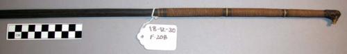 Bastão Varinha feminina Acessar item no Acervo do museu de origemDocumentação Em “Termos de Uso”, disponíveis em (https://www.peabody.harvard.edu/node/778) explicita-se que o website é mantido pelo Peabody Museum of Archaeology and Ethnology, da Universidade de Harvard, que pode alterá-los a qualquer momento sem aviso prévio. O uso do website deve estar em concordância com: 1. O Site e grande parte do texto, imagens, gráficos, clipes de áudio e vídeo, informações e outros conteúdos do Site (coletivamente, o “Conteúdo”) são protegidos por direitos autorais, marcas registradas e outras leis. 2. O Conteúdo é disponibilizado somente para seu uso pessoal limitado, não comercial para fins educacionais ou acadêmicos, ou para outro uso justo na extensão permitida pela lei de direitos autorais dos Estados Unidos. A menos que especificado de outra forma no Site, você pode empregar as funções normais de seu navegador para baixar e imprimir uma única cópia de arquivos de Conteúdo individuais para tal uso, desde que você mantenha todos os direitos autorais e outros avisos de propriedade associados ao Conteúdo. Você deve citar o autor/artista e a fonte do Conteúdo como se fosse conteúdo de qualquer trabalho impresso, e a citação deve incluir a URL www.peabody.harvard.edu; 3. Concedem a permissão limitada acima sob os direitos autorais que possuem. Os direitos autorais e outros direitos sobre o Conteúdo também podem ser detidos por outros indivíduos ou entidades, incluindo artistas e outros detentores de direitos sobre as coleções do Museu Peabody reproduzidas no Site; 4. Usos Proibidos. É proibido copiar, exibir, publicar, distribuir, transmitir, modificar, executar ou utilizar ou explorar qualquer Conteúdo protegido no Site para qualquer propósito comercial ou com o propósito de torná-lo publicamente disponível. É proibido incluir qualquer Conteúdo protegido em um banco de dados, website ou recurso eletrônico, e de fazer qualquer outro uso do Conteúdo protegido que não seja expressamente permitido pela Seção 2; 5. Para solicitar permissão, sob direitos controlados por nós, para qualquer uso de outra forma proibido, favor entrar em contato com o Peabody Museum of Archaeology and Ethnology’s Office of Rights and ReproductionsPovo Indígena Karajá Autodenominação: Iny Iny Karaja Outros nomes para o povo: Carajás Localização: America do SulBrasilGoiás (GO)Mato Grosso (MT)Pará (PA)Tocantins (TO)Museu Peabody Museum (Cambridge, EUA) Localização: América do NorteCambridgeEstados Unidos Número de tombo: 18-12-30/F208 Número anterior: 18-12-30/F208Tipo de Acervo: EtnológicoCaracterísticas Dimensões: 117,7 x 1,2 x 2,1 cm 46 5,16 x 1,2 x 13,16 cm Quantidade de componentes: 1 Material/Suporte: Madeira, corda, fibra, osso?Tesauro (FUNAI) Matérias Primas: Fibra VegetalMadeiraOssoProduto de origem AnimalProduto de origem VegetalProveniência Coleta: América do Sul, BrasilHistórico Cedente: Anônimo Coletor:Anônimo Forma de Aquisição: : Selecione Exportar ObraVarinha feminina