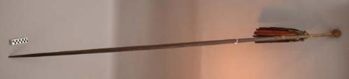 Bastão Bastão cerimonial com decoração elaborada de penas Acessar item no Acervo do museu de origemDocumentação Em “Termos de Uso”, disponíveis em (https://www.peabody.harvard.edu/node/778) explicita-se que o website é mantido pelo Peabody Museum of Archaeology and Ethnology, da Universidade de Harvard, que pode alterá-los a qualquer momento sem aviso prévio. O uso do website deve estar em concordância com: 1. O Site e grande parte do texto, imagens, gráficos, clipes de áudio e vídeo, informações e outros conteúdos do Site (coletivamente, o “Conteúdo”) são protegidos por direitos autorais, marcas registradas e outras leis. 2. O Conteúdo é disponibilizado somente para seu uso pessoal limitado, não comercial para fins educacionais ou acadêmicos, ou para outro uso justo na extensão permitida pela lei de direitos autorais dos Estados Unidos. A menos que especificado de outra forma no Site, você pode empregar as funções normais de seu navegador para baixar e imprimir uma única cópia de arquivos de Conteúdo individuais para tal uso, desde que você mantenha todos os direitos autorais e outros avisos de propriedade associados ao Conteúdo. Você deve citar o autor/artista e a fonte do Conteúdo como se fosse conteúdo de qualquer trabalho impresso, e a citação deve incluir a URL www.peabody.harvard.edu; 3. Concedem a permissão limitada acima sob os direitos autorais que possuem. Os direitos autorais e outros direitos sobre o Conteúdo também podem ser detidos por outros indivíduos ou entidades, incluindo artistas e outros detentores de direitos sobre as coleções do Museu Peabody reproduzidas no Site; 4. Usos Proibidos. É proibido copiar, exibir, publicar, distribuir, transmitir, modificar, executar ou utilizar ou explorar qualquer Conteúdo protegido no Site para qualquer propósito comercial ou com o propósito de torná-lo publicamente disponível. É proibido incluir qualquer Conteúdo protegido em um banco de dados, website ou recurso eletrônico, e de fazer qualquer outro uso do Conteúdo protegido que não seja expressamente permitido pela Seção 2; 5. Para solicitar permissão, sob direitos controlados por nós, para qualquer uso de outra forma proibido, favor entrar em contato com o Peabody Museum of Archaeology and Ethnology’s Office of Rights and ReproductionsPovo Indígena Canela Apanyekrá Localização: America do SulBrasilMaranhão (MA)Museu Peabody Museum (Cambridge, EUA) Localização: América do NorteCambridgeEstados Unidos Número de tombo: 61-7-30/8223 Número anterior: 61-7-30/8223Tipo de Acervo: EtnológicoCaracterísticas Dimensões: 190 x 6,5 cm 74 13,16 x 2 9,16 cm Quantidade de componentes: 1 Material/Suporte: Madeira, algodão, penas, vidro, material orgânico, cordão de algodão, vagem de sementesTesauro (FUNAI) Artefatos: Bastao CerimonialEquipamento mágico-ritual Matérias Primas: Fibra VegetalMadeiraPenaProduto de origem AnimalProduto de origem VegetalProduto industrializadoSementeProveniência Coleta: América do Sul, BrasilHistórico Cedente: Anônimo Coletor:Museu Peabody Forma de Aquisição: : Selecione Exportar ObraBastão cerimonial com decoração elaborada de penas