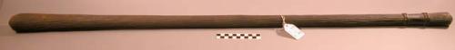 Borduna Bastão Acessar item no Acervo do museu de origemDocumentação Em “Termos de Uso”, disponíveis em (https://www.peabody.harvard.edu/node/778) explicita-se que o website é mantido pelo Peabody Museum of Archaeology and Ethnology, da Universidade de Harvard, que pode alterá-los a qualquer momento sem aviso prévio. O uso do website deve estar em concordância com: 1. O Site e grande parte do texto, imagens, gráficos, clipes de áudio e vídeo, informações e outros conteúdos do Site (coletivamente, o “Conteúdo”) são protegidos por direitos autorais, marcas registradas e outras leis. 2. O Conteúdo é disponibilizado somente para seu uso pessoal limitado, não comercial para fins educacionais ou acadêmicos, ou para outro uso justo na extensão permitida pela lei de direitos autorais dos Estados Unidos. A menos que especificado de outra forma no Site, você pode empregar as funções normais de seu navegador para baixar e imprimir uma única cópia de arquivos de Conteúdo individuais para tal uso, desde que você mantenha todos os direitos autorais e outros avisos de propriedade associados ao Conteúdo. Você deve citar o autor/artista e a fonte do Conteúdo como se fosse conteúdo de qualquer trabalho impresso, e a citação deve incluir a URL www.peabody.harvard.edu; 3. Concedem a permissão limitada acima sob os direitos autorais que possuem. Os direitos autorais e outros direitos sobre o Conteúdo também podem ser detidos por outros indivíduos ou entidades, incluindo artistas e outros detentores de direitos sobre as coleções do Museu Peabody reproduzidas no Site; 4. Usos Proibidos. É proibido copiar, exibir, publicar, distribuir, transmitir, modificar, executar ou utilizar ou explorar qualquer Conteúdo protegido no Site para qualquer propósito comercial ou com o propósito de torná-lo publicamente disponível. É proibido incluir qualquer Conteúdo protegido em um banco de dados, website ou recurso eletrônico, e de fazer qualquer outro uso do Conteúdo protegido que não seja expressamente permitido pela Seção 2; 5. Para solicitar permissão, sob direitos controlados por nós, para qualquer uso de outra forma proibido, favor entrar em contato com o Peabody Museum of Archaeology and Ethnology’s Office of Rights and ReproductionsPovo Indígena Karajá Autodenominação: Iny Iny Karaja Outros nomes para o povo: Carajás Localização: America do SulBrasilGoiás (GO)Mato Grosso (MT)Pará (PA)Tocantins (TO)Museu Peabody Museum (Cambridge, EUA) Localização: América do NorteCambridgeEstados Unidos Número de tombo: 18-12-30/F128 Número anterior: 18-12-30/F128Tipo de Acervo: EtnológicoCaracterísticas Dimensões: 117,8 x 4,9 x 3,2 cm 46 3,8 x 1 15,16 x 1 1,4 cm Quantidade de componentes: 1 Material/Suporte: MadeiraTesauro (FUNAI) Artefatos: Arma de ChoqueBordunaEquipamento para caça, pesca, ataque/defesa Matérias Primas: MadeiraProduto de origem VegetalProveniência Coleta: América do Sul, BrasilHistórico Cedente: Anônimo Coletor:Anônimo Forma de Aquisição: : Selecione Exportar ObraBastão