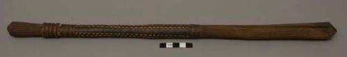 Borduna Bastão Acessar item no Acervo do museu de origemDocumentação Em “Termos de Uso”, disponíveis em (https://www.peabody.harvard.edu/node/778) explicita-se que o website é mantido pelo Peabody Museum of Archaeology and Ethnology, da Universidade de Harvard, que pode alterá-los a qualquer momento sem aviso prévio. O uso do website deve estar em concordância com: 1. O Site e grande parte do texto, imagens, gráficos, clipes de áudio e vídeo, informações e outros conteúdos do Site (coletivamente, o “Conteúdo”) são protegidos por direitos autorais, marcas registradas e outras leis. 2. O Conteúdo é disponibilizado somente para seu uso pessoal limitado, não comercial para fins educacionais ou acadêmicos, ou para outro uso justo na extensão permitida pela lei de direitos autorais dos Estados Unidos. A menos que especificado de outra forma no Site, você pode empregar as funções normais de seu navegador para baixar e imprimir uma única cópia de arquivos de Conteúdo individuais para tal uso, desde que você mantenha todos os direitos autorais e outros avisos de propriedade associados ao Conteúdo. Você deve citar o autor/artista e a fonte do Conteúdo como se fosse conteúdo de qualquer trabalho impresso, e a citação deve incluir a URL www.peabody.harvard.edu; 3. Concedem a permissão limitada acima sob os direitos autorais que possuem. Os direitos autorais e outros direitos sobre o Conteúdo também podem ser detidos por outros indivíduos ou entidades, incluindo artistas e outros detentores de direitos sobre as coleções do Museu Peabody reproduzidas no Site; 4. Usos Proibidos. É proibido copiar, exibir, publicar, distribuir, transmitir, modificar, executar ou utilizar ou explorar qualquer Conteúdo protegido no Site para qualquer propósito comercial ou com o propósito de torná-lo publicamente disponível. É proibido incluir qualquer Conteúdo protegido em um banco de dados, website ou recurso eletrônico, e de fazer qualquer outro uso do Conteúdo protegido que não seja expressamente permitido pela Seção 2; 5. Para solicitar permissão, sob direitos controlados por nós, para qualquer uso de outra forma proibido, favor entrar em contato com o Peabody Museum of Archaeology and Ethnology’s Office of Rights and ReproductionsPovo Indígena Karajá Autodenominação: Iny Iny Karaja Outros nomes para o povo: Carajás Localização: America do SulBrasilGoiás (GO)Mato Grosso (MT)Pará (PA)Tocantins (TO)Museu Peabody Museum (Cambridge, EUA) Localização: América do NorteCambridgeEstados Unidos Número de tombo: 18-12-30/F137.3 Número anterior: 18-12-30/F137.3Tipo de Acervo: EtnológicoCaracterísticas Dimensões: 51,7 x 2,8 x 2,5 cm 20 3,8 x 1 1,8 x 1 cm Quantidade de componentes: 1 Material/Suporte: Madeira, fibraTesauro (FUNAI) Artefatos: Arma de ChoqueBordunaEquipamento para caça, pesca, ataque/defesa Matérias Primas: Fibra VegetalMadeiraProduto de origem VegetalProveniência Coleta: América do Sul, BrasilHistórico Cedente: Anônimo Coletor:Anônimo Forma de Aquisição: : Selecione Exportar ObraBastão
