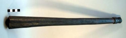 Borduna Bastão Acessar item no Acervo do museu de origemDocumentação Em “Termos de Uso”, disponíveis em (https://www.peabody.harvard.edu/node/778) explicita-se que o website é mantido pelo Peabody Museum of Archaeology and Ethnology, da Universidade de Harvard, que pode alterá-los a qualquer momento sem aviso prévio. O uso do website deve estar em concordância com: 1. O Site e grande parte do texto, imagens, gráficos, clipes de áudio e vídeo, informações e outros conteúdos do Site (coletivamente, o “Conteúdo”) são protegidos por direitos autorais, marcas registradas e outras leis. 2. O Conteúdo é disponibilizado somente para seu uso pessoal limitado, não comercial para fins educacionais ou acadêmicos, ou para outro uso justo na extensão permitida pela lei de direitos autorais dos Estados Unidos. A menos que especificado de outra forma no Site, você pode empregar as funções normais de seu navegador para baixar e imprimir uma única cópia de arquivos de Conteúdo individuais para tal uso, desde que você mantenha todos os direitos autorais e outros avisos de propriedade associados ao Conteúdo. Você deve citar o autor/artista e a fonte do Conteúdo como se fosse conteúdo de qualquer trabalho impresso, e a citação deve incluir a URL www.peabody.harvard.edu; 3. Concedem a permissão limitada acima sob os direitos autorais que possuem. Os direitos autorais e outros direitos sobre o Conteúdo também podem ser detidos por outros indivíduos ou entidades, incluindo artistas e outros detentores de direitos sobre as coleções do Museu Peabody reproduzidas no Site; 4. Usos Proibidos. É proibido copiar, exibir, publicar, distribuir, transmitir, modificar, executar ou utilizar ou explorar qualquer Conteúdo protegido no Site para qualquer propósito comercial ou com o propósito de torná-lo publicamente disponível. É proibido incluir qualquer Conteúdo protegido em um banco de dados, website ou recurso eletrônico, e de fazer qualquer outro uso do Conteúdo protegido que não seja expressamente permitido pela Seção 2; 5. Para solicitar permissão, sob direitos controlados por nós, para qualquer uso de outra forma proibido, favor entrar em contato com o Peabody Museum of Archaeology and Ethnology’s Office of Rights and ReproductionsPovo Indígena Kayapó Autodenominação: Mebengôkre Outros nomes para o povo: Txukarramãe Kayapó-Irã'ãmranh-re Localização: America do SulBrasilMato Grosso (MT)Pará (PA)Museu Peabody Museum (Cambridge, EUA) Localização: América do NorteCambridgeEstados Unidos Número de tombo: 18-12-30/F219.3 Número anterior: 18-12-30/F219.3Tipo de Acervo: EtnológicoCaracterísticas Dimensões: 54,5 x 5 cm 21 7,16 x 1 15,16 cm Quantidade de componentes: 1 Material/Suporte: MadeiraTesauro (FUNAI) Artefatos: Arma de ChoqueBordunaEquipamento para caça, pesca, ataque/defesa Matérias Primas: MadeiraProduto de origem VegetalProveniência Coleta: América do Sul, BrasilHistórico Cedente: Anônimo Coletor:Anônimo Forma de Aquisição: : Selecione Exportar ObraBastão