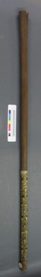 Bastão cilíndrico com ranhuras longitudinais ao longo do comprimento e cabeça ligeiramente expandida com ponto terminal central. A extremidade do cabo é amarrada em trançado decorativo de cores neutra e preta. A coronha tem um colarinho expandido e uma extremidade quadrada.