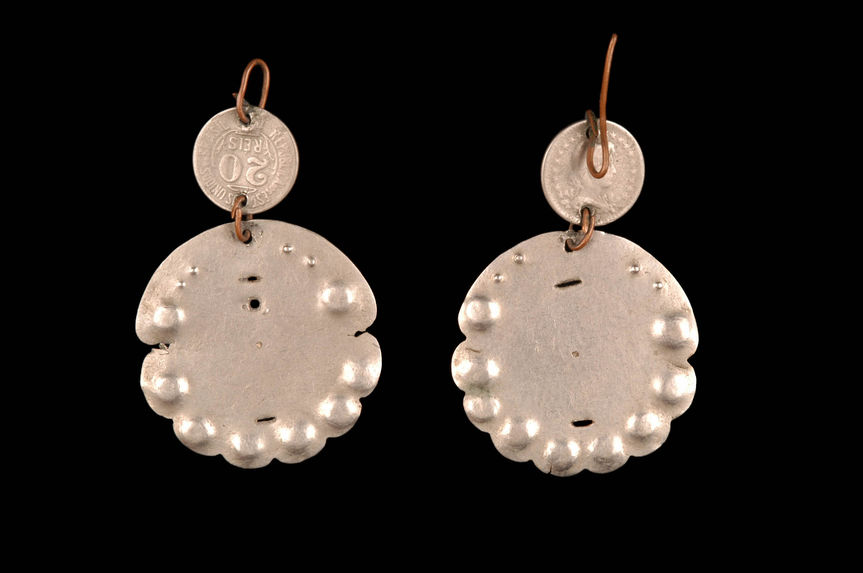 Função: Pingente de colar de mulher. Feito por homens com moedas de diniélo (corrupção do dinheiro português) marteladas na parte plana do machado e empurradas para trás com pregos.