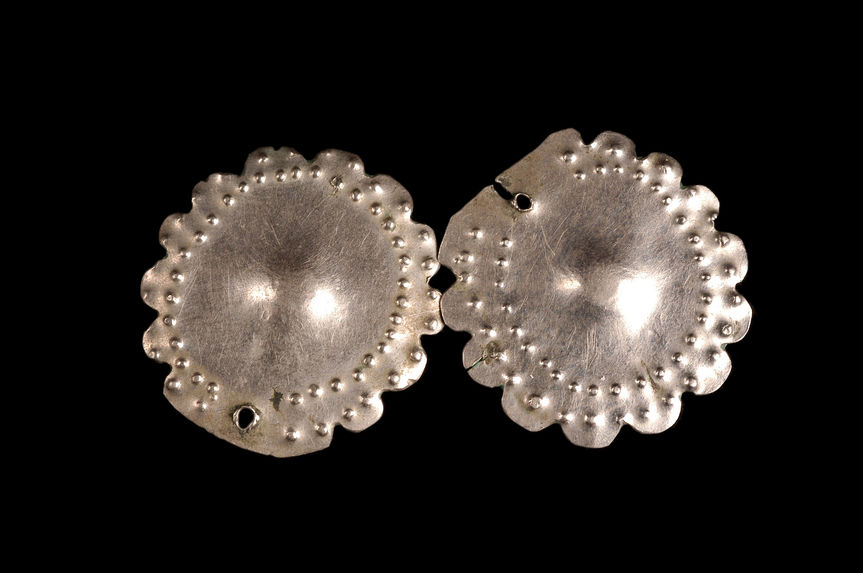 Função: Pingente de colar de mulher. Feito por homens com moedas de diniélo (corrupção do dinheiro português) marteladas na parte plana do machado e empurradas para trás com pregos.