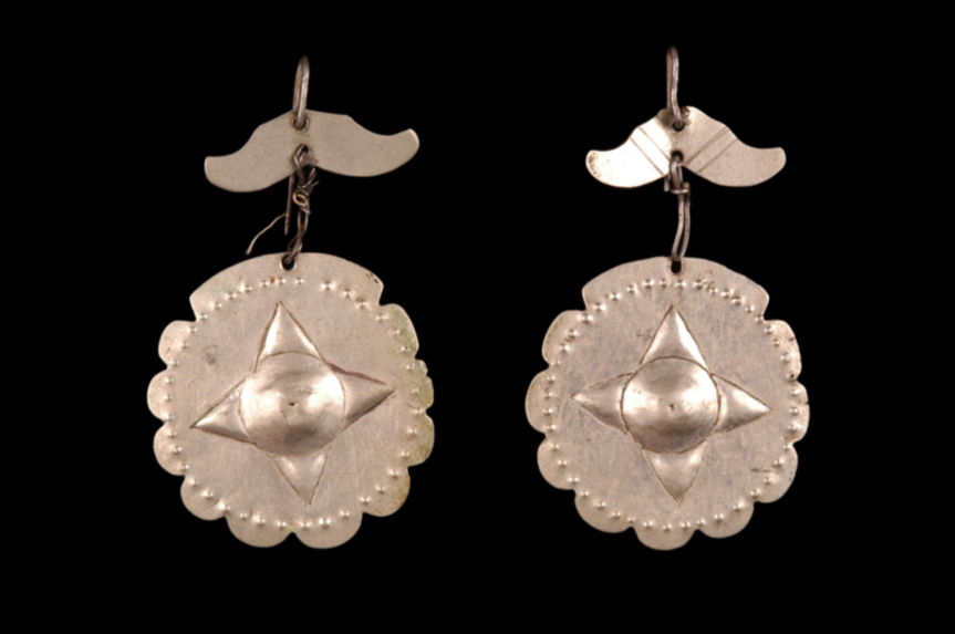 Função: Pingente de colar de mulher. Feito por homens com moedas de diniélo (corrupção do dinheiro português) marteladas na parte plana do machado e empurradas para trás com pregos.