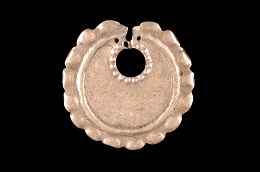 Função: Pingente de colar de mulher. Feito por homens com moedas de diniélo (corrupção do dinheiro português) marteladas na parte plana do machado e empurradas para trás com pregos.