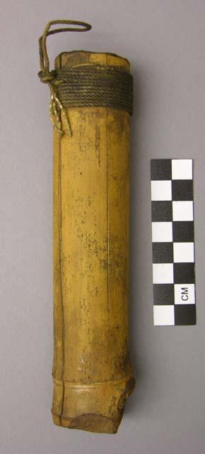 Caixa Bambu “caixa de rapé” Acessar item no Acervo do museu de origemDocumentação Em “Termos de Uso”, disponíveis em (https://www.peabody.harvard.edu/node/778) explicita-se que o website é mantido pelo Peabody Museum of Archaeology and Ethnology, da Universidade de Harvard, que pode alterá-los a qualquer momento sem aviso prévio. O uso do website deve estar em concordância com: 1. O Site e grande parte do texto, imagens, gráficos, clipes de áudio e vídeo, informações e outros conteúdos do Site (coletivamente, o “Conteúdo”) são protegidos por direitos autorais, marcas registradas e outras leis. 2. O Conteúdo é disponibilizado somente para seu uso pessoal limitado, não comercial para fins educacionais ou acadêmicos, ou para outro uso justo na extensão permitida pela lei de direitos autorais dos Estados Unidos. A menos que especificado de outra forma no Site, você pode empregar as funções normais de seu navegador para baixar e imprimir uma única cópia de arquivos de Conteúdo individuais para tal uso, desde que você mantenha todos os direitos autorais e outros avisos de propriedade associados ao Conteúdo. Você deve citar o autor/artista e a fonte do Conteúdo como se fosse conteúdo de qualquer trabalho impresso, e a citação deve incluir a URL www.peabody.harvard.edu; 3. Concedem a permissão limitada acima sob os direitos autorais que possuem. Os direitos autorais e outros direitos sobre o Conteúdo também podem ser detidos por outros indivíduos ou entidades, incluindo artistas e outros detentores de direitos sobre as coleções do Museu Peabody reproduzidas no Site; 4. Usos Proibidos. É proibido copiar, exibir, publicar, distribuir, transmitir, modificar, executar ou utilizar ou explorar qualquer Conteúdo protegido no Site para qualquer propósito comercial ou com o propósito de torná-lo publicamente disponível. É proibido incluir qualquer Conteúdo protegido em um banco de dados, website ou recurso eletrônico, e de fazer qualquer outro uso do Conteúdo protegido que não seja expressamente permitido pela Seção 2; 5. Para solicitar permissão, sob direitos controlados por nós, para qualquer uso de outra forma proibido, favor entrar em contato com o Peabody Museum of Archaeology and Ethnology’s Office of Rights and ReproductionsPovo Indígena Karajá Autodenominação: Iny Iny Karaja Outros nomes para o povo: Carajás Localização: America do SulBrasilGoiás (GO)Mato Grosso (MT)Pará (PA)Tocantins (TO)Museu Peabody Museum (Cambridge, EUA) Localização: América do NorteCambridgeEstados Unidos Número de tombo: 18-12-30/F172 Número anterior: 18-12-30/F172Tipo de Acervo: EtnológicoCaracterísticas Dimensões: 16 x 3,5 x 3,3 cm 6 5,16 x 1 3,8 x 1 5,16 cm Quantidade de componentes: 1 Material/Suporte: Bambu, corda, papelTesauro (FUNAI) Artefatos: Equipamento para uso pessoalEstojo Matérias Primas: Fibra VegetalProduto de origem VegetalProduto industrializadoProveniência Coleta: América do Sul, BrasilHistórico Cedente: Anônimo Coletor:Anônimo Forma de Aquisição: : Selecione Exportar ObraBambu “caixa de rapé”