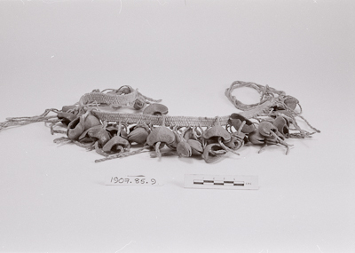 Chocalho feito com 4 pedaços de barbante com peças mais curtas tecidas, as cápsulas de frutos são enfiadas a partir desses comprimentos mais curtos. Existem 34 linhas que prendem as cápslas de frutos e mais 12 das quais as cápsulas foram perdidas.
