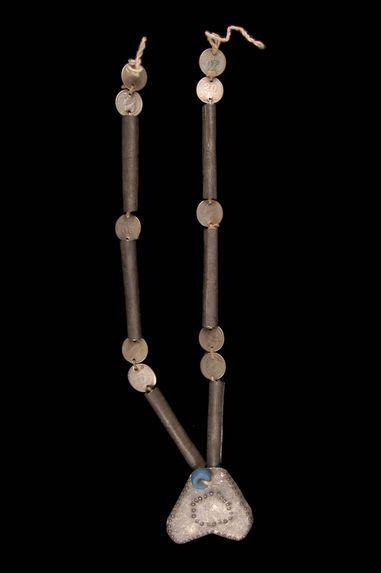 Função: Usado por mulheres. Feito por homens, o pingente em caixa de folha de flandres cortado com tesoura e martelado, outras moedas furadas ou marteladas na parte plana do machado, e empurrado para trás com pregos.