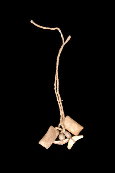 Material/Suporte: Fibra têxtil (algodão), dente (cachorro), concha, relva