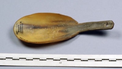 Colher de chifre esculpido com tigela oval e cabo curto.